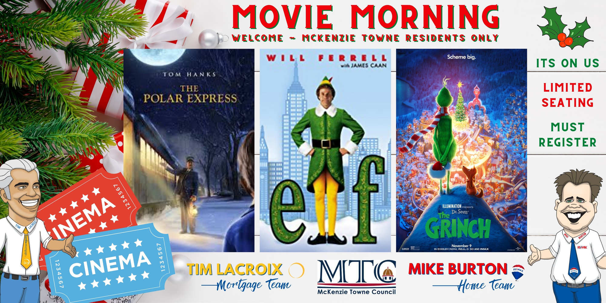 Hey McKenzie Towners, come enjoy a FREE Saturday morning at the movies! Brought to you by your McKenzie Towne Council and your Annual Community Event Sponsors, Mike Burton & Tim Lacroix! Choose one of the following Christmas Classic movies: